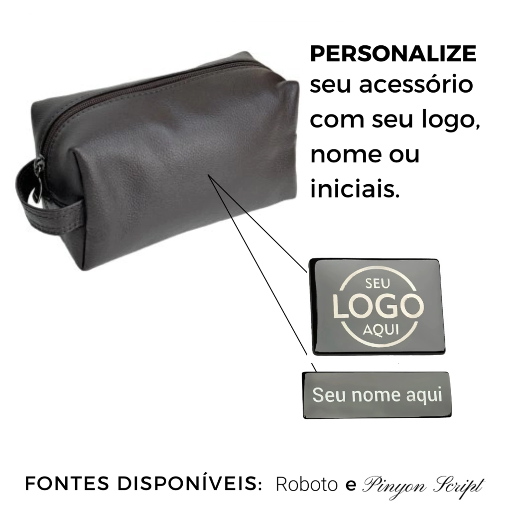A Necessaire De Couro Masculina pode ser personalizada. Disponibilizamos uma plaquinha de metal que é fixada na necessaire, onde você pode gravar seu logotipo, nome, frase ou iniciais. O serviço de personalização é opcional e pode ser selecionado no seu carrinho de compras, com prazo de despacho do produto personalizado em até 5 dias úteis.