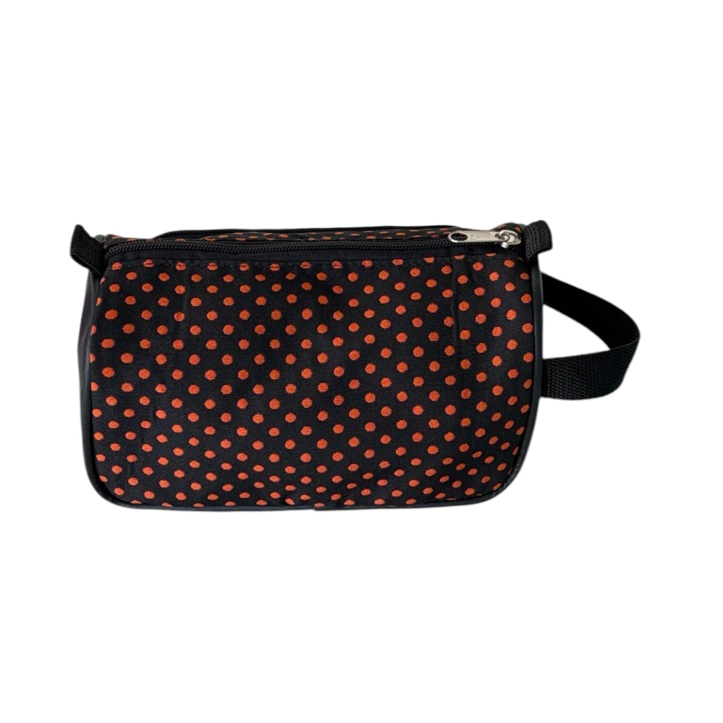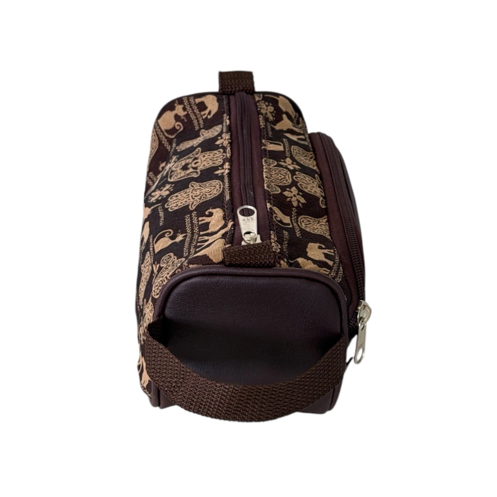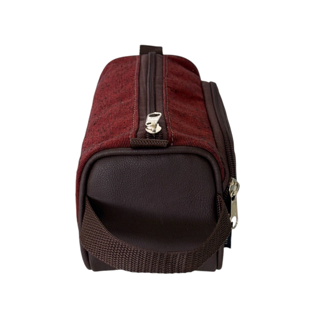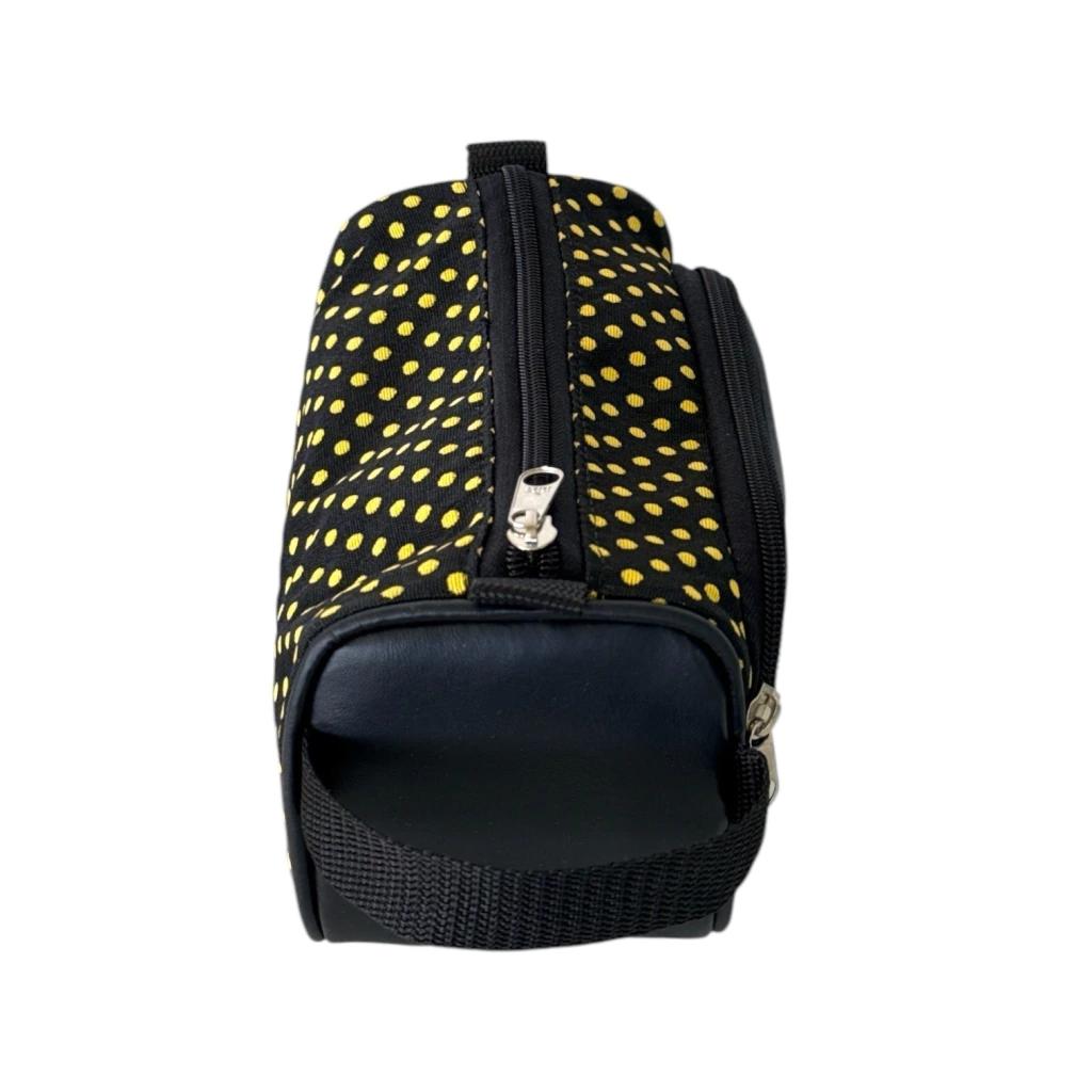 Possui alça de mão na lateral, Suas duas divisórias permitem transportar separadamente os produtos de higiene dos acessórios e demais objetos menores.